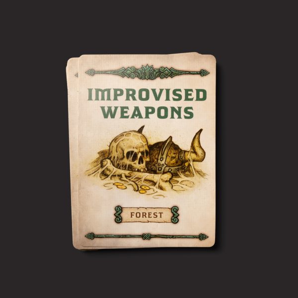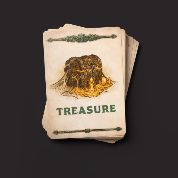 - Illustrated playing cards for combat initiative, improvised weapons, adventures, and treasure